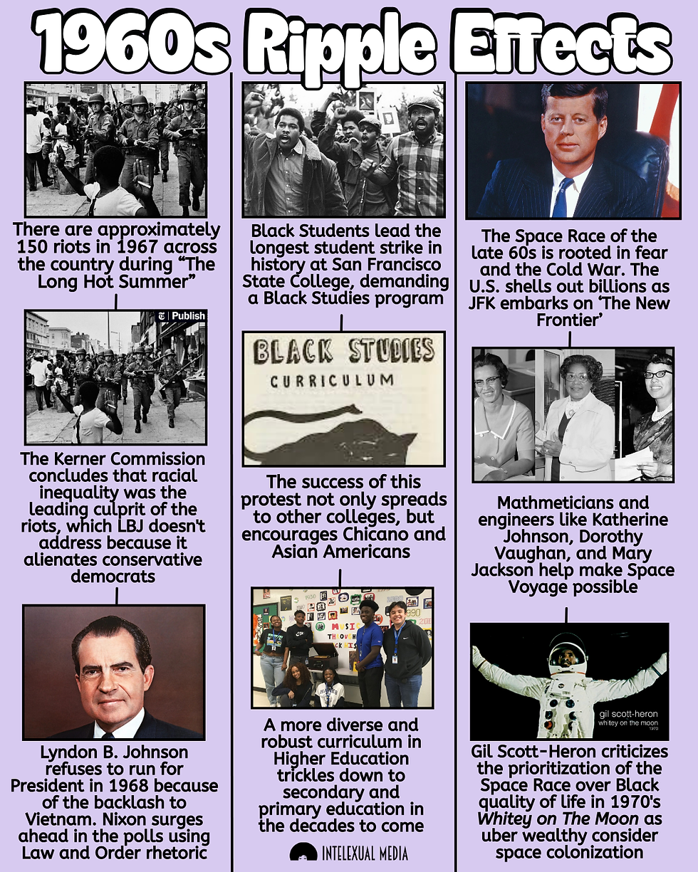 The 1960s are arguably one of the most turbulent and consequential decades in American history. Despite the Vietnam War, numerous political assassinations, the intimidation of COINTELPRO, violent terrorism, and the continuation of American-As-Apple-Pie racism, Black Americans forged ahead to accomplish new achievements in politics, culture, and education that scores of us would benefit from in the future.